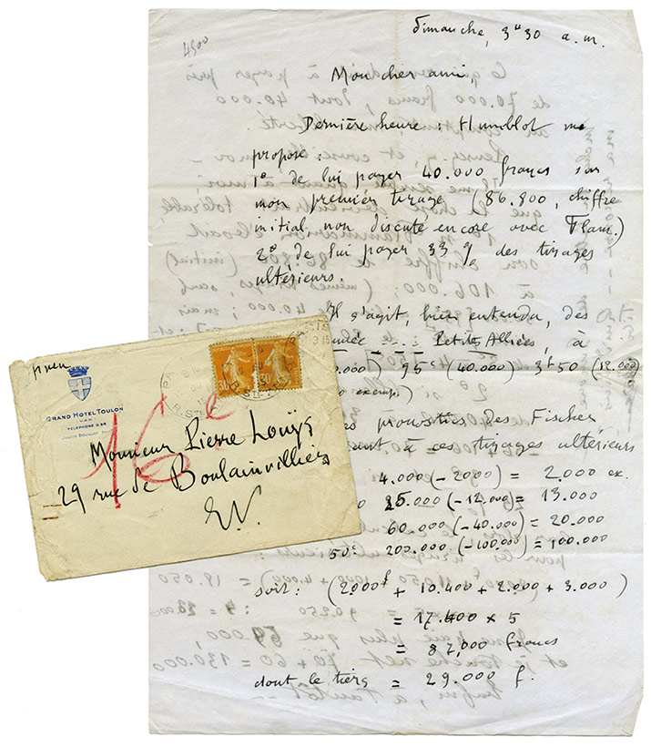 Lettre autographe signéeLettre autographe, signée « Claude », adressée à Pierre Louÿs. « Dimanche, 3 h 30 a.m.» ; 2 pages in-4°, enveloppe timbrée de Paris avec cachet du 12 septembre 1915.Longue lettre d’ordre financier sur le prix de ses tirages....