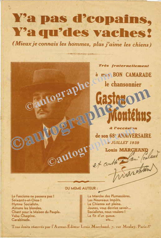 Pièce signéePièce signée par Louis Marchand. 1939 ; 4 pages in-4°. Pièce illustrée de sa photographiecontenant sur un feuillet de 4 pages, sa photographie, la chanson « Y’a pas d’copains, Y’a qu’des vaches ! ». Dédicace sur la première...