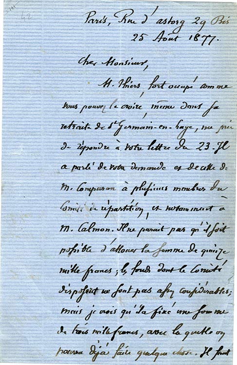 Lettre autographe signéeLettre autographe signée. Paris, 25 août 1877 ; 2 pages 1/2 in8, petites fentes au plis.« M. Thiers, fort occupé comme vous pouvez le croire dans la retraite de St Germain-en-Laye, me prie de répondre à votre lettre du 23. […] M....