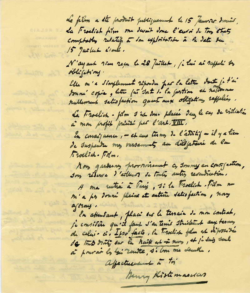 Lettre autographe signéeLongue lettre autographe signée, adressée à A. Bloch. Bassou, Yonne, 25 août 1930 ; 2 pages in-4°. Lettre en rapport à un contrat sur le film produit à partir de son œuvre « La Nuit est à vous ».