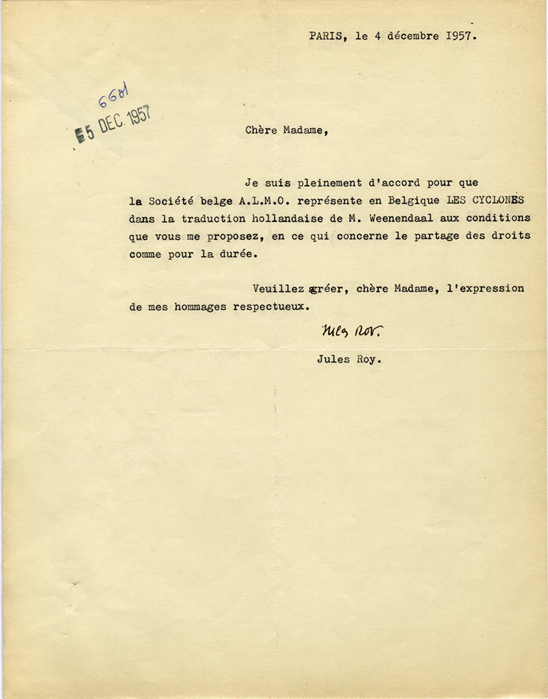 Lettre signéeLettre dactylographiée signée, adressée à une femme. Paris, 4 décembre 1957 ; 1 page in-4°. « Je suis pleinement d’accord pour que la Société belge A.L.M.O représente en Belgique les Cyclones dans la traduction hollandaise de...