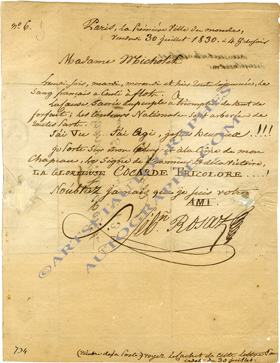 Lettre autographe signéeLettre autographe signée, adressée à Mme Micholet. Paris, « vendredi 30 juillet 1830 à 4 h du soir » ; 1 page in-4°.Extraordinaire lettre révolutionnaire d’un Français célébrant la révolution de 1830 :« Paris la première...