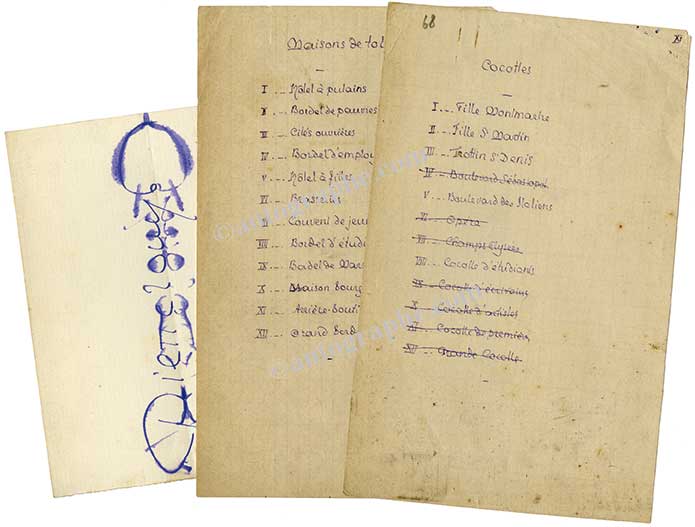 Lettre autographe signéeDOSSIER ÉROTIQUE : ensemble de 6 pièces autographes. Sans date ; 1 page in-12 chacune :— Dessin signé. Sans date ; 1 page in-16. Dessin à l’encre violette, symétrique, obtenu après pliage. Dessin érotique représentant un...