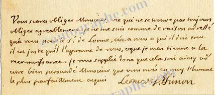 Lettre autographe signéeLettre autographe signée, adressée à M. de Chiron. La Ferté, 20 août 1740 ; 1/2 page in-8°. « Vous scavez obliger, Monsieur, ce qui ne se trouve pas toujours obliger agreablement. Je ne me suis comme de raison adressé qu’à vous...