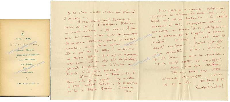 Lettre autographe signéeTrès intéressant ensemble de livres et lettres adressées à l’écrivain belge Albert T’SERSTEVENS. Cet échange de livres avec envois et de lettres éclaire d’un jour nouveau les relations entre les deux écrivains.— « SAINT...