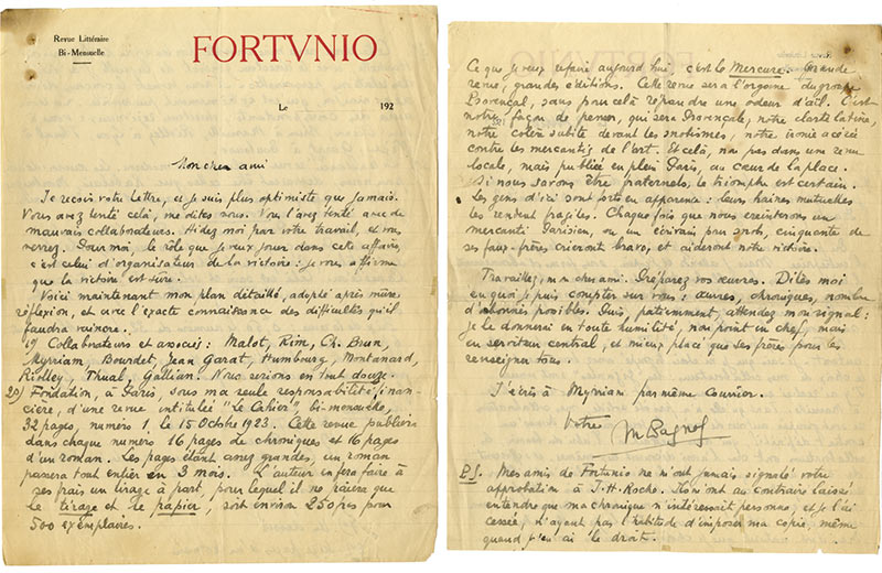 Lettre autographe signéeLettre autographe signée, adressée à un ami. 17 juin 1923 ; 4 page in-4°. En-tête de la revue littéraire « Fortunio ». Longue lettre détaillée, relative à la nouvelle entreprise qu’il veut monter, fondée à Paris, sous sa...