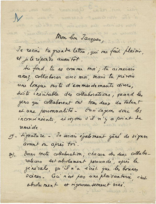 Lettre autographe signée, adressée à Jacques NatansonLettre autographe signée, adressée à Jacques Natanson. 6 pages in-4°. « Au fond, tu es comme moi ; tu aimerai assez collaborer avec moi, mais tu prévois une longue suite d’emmerdements divers, suite inévitable des collaborations,...