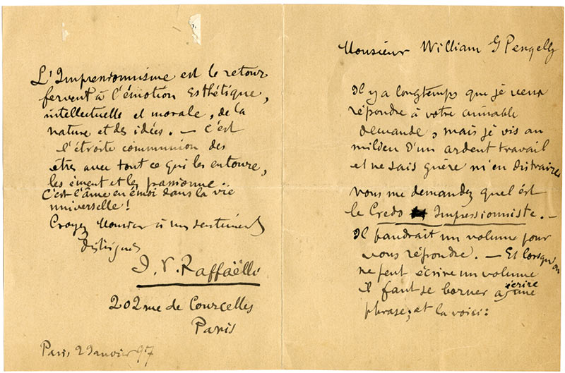 Lettre autographe signéeLettre autographe signée, adressée à M. William Pengelg. Paris, 2 janvier 1897 ; 2 pages in-12.Extraordinaire lettre sur l’impressionnisme. « Il y a longtemps que je veux répondre à votre aimable demande, mais je vis au milieu...