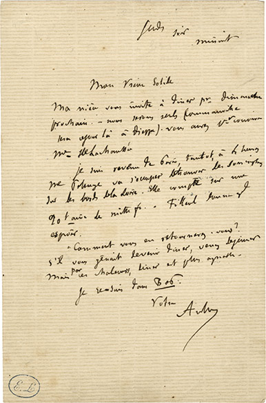 Lettre autographe signéeLettre autographe signée, adressée à Émile Laporte. « Jeudi soir, minuit » [1878] ; 1 page in-8°. ...