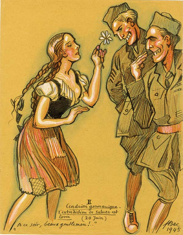 Dessin original à l’encre et aux crayons de couleurs, signé et légendé.Dessin original à l’encre et aux crayons de couleurs, signé et légendé. 1945 ; 27 x 21 cm. Caricature satirique : « Cendrion germanique. L’interdiction de saluer est levée (20 juin). À ce soir, beaux gentlemen ! »