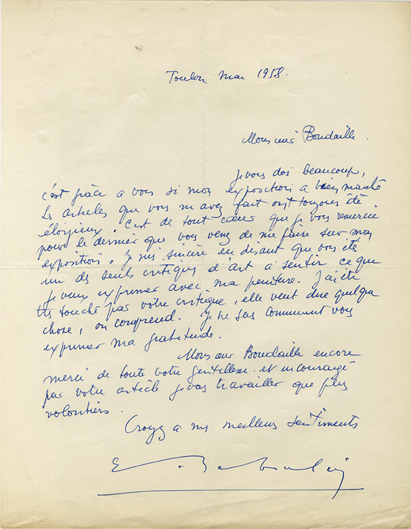 Lettre autographe signéeLettre autographe signée, adressée au critique dart Georges Boudaille. Toulon, mai 1958 ; 1 page in-4°. « Je vous dois beaucoup, cest grâce à vous si mon exposition a bien marché. Les articles que vous mavez fait ont toujours...