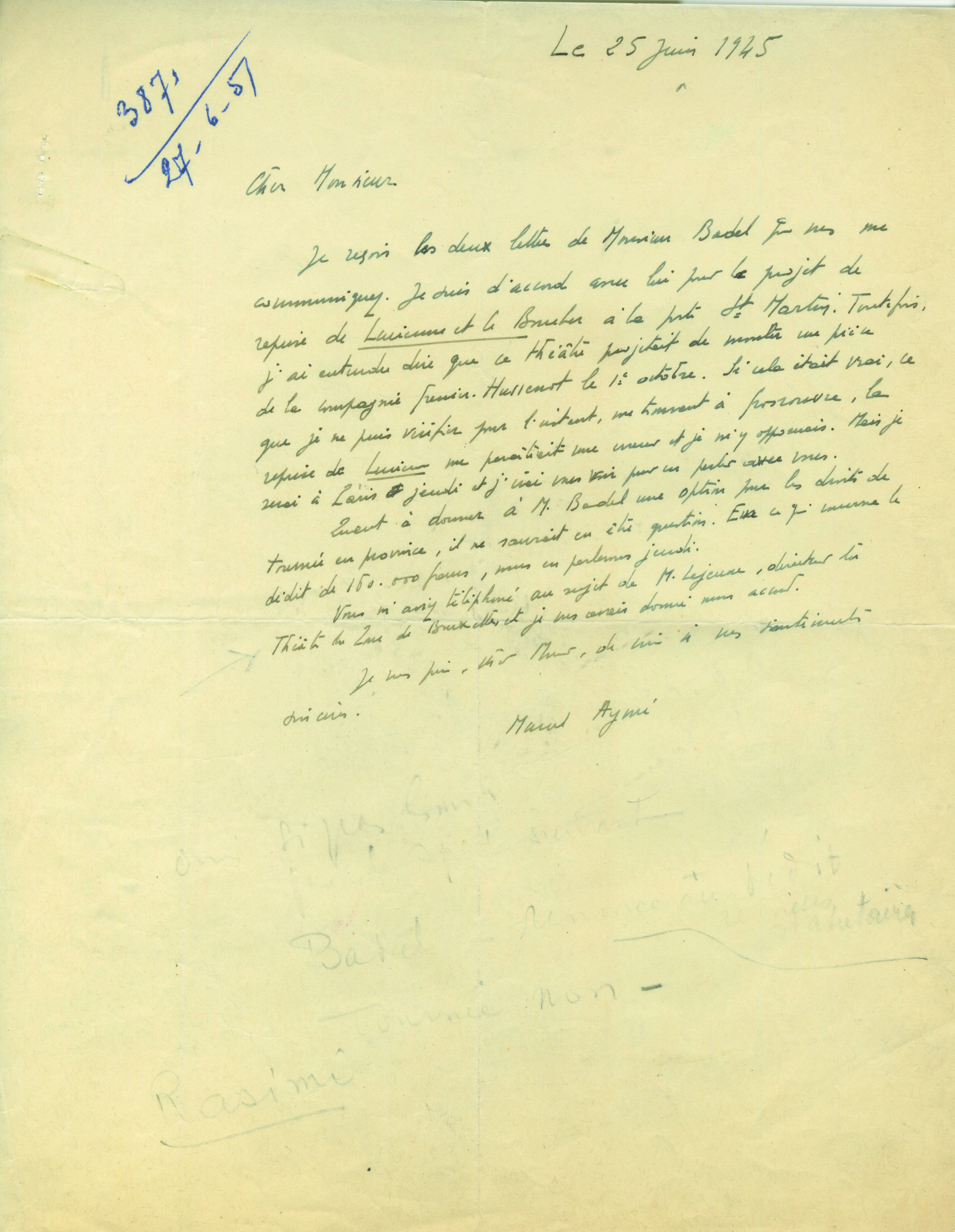lettre autographe signéeLettre autographe signée adressée à un cher Monsieur, 25 juin 1945 ; 1 page in-4. Avec des annotations au crayon très effacées (de la main du destinataire). ...