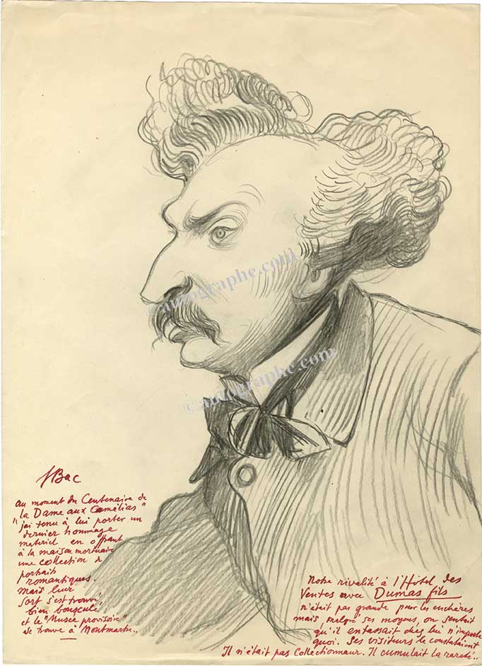 Dessin autographe signéDessin original au crayon noir, légendé et signé à l’encre rouge. Sans date ; 165 x 225 mm. Dessin représentant Alexandre Dumas. « Au moment du centenaire de La Dame aux Camélias, j’ai tenu à lui porter un dernier hommage...