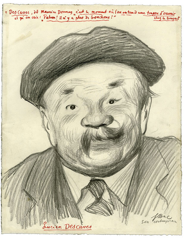 Dessin autographe signéDessin original signé « Lucien Descaves ». [1951] ; 270 X 210 mm à la mine de plomb et encre rouge pour la partie écrite. Portrait de Lucien Descaves, légendé : « Descaves, dit Maurice Donnay, c’est le moment où l’on entend une...