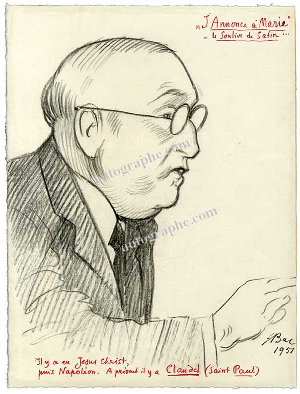 Dessin autographe signéDessin original signé « Paul Claudel ». [1951] ; 270 X 205 mm à la mine de plomb et encre rouge pour la partie écrite. Portrait de Paul Claudel, légendé : « Il y a eu Jésus Christ, puis Napoléon. À présent il y a Claudel (Saint...