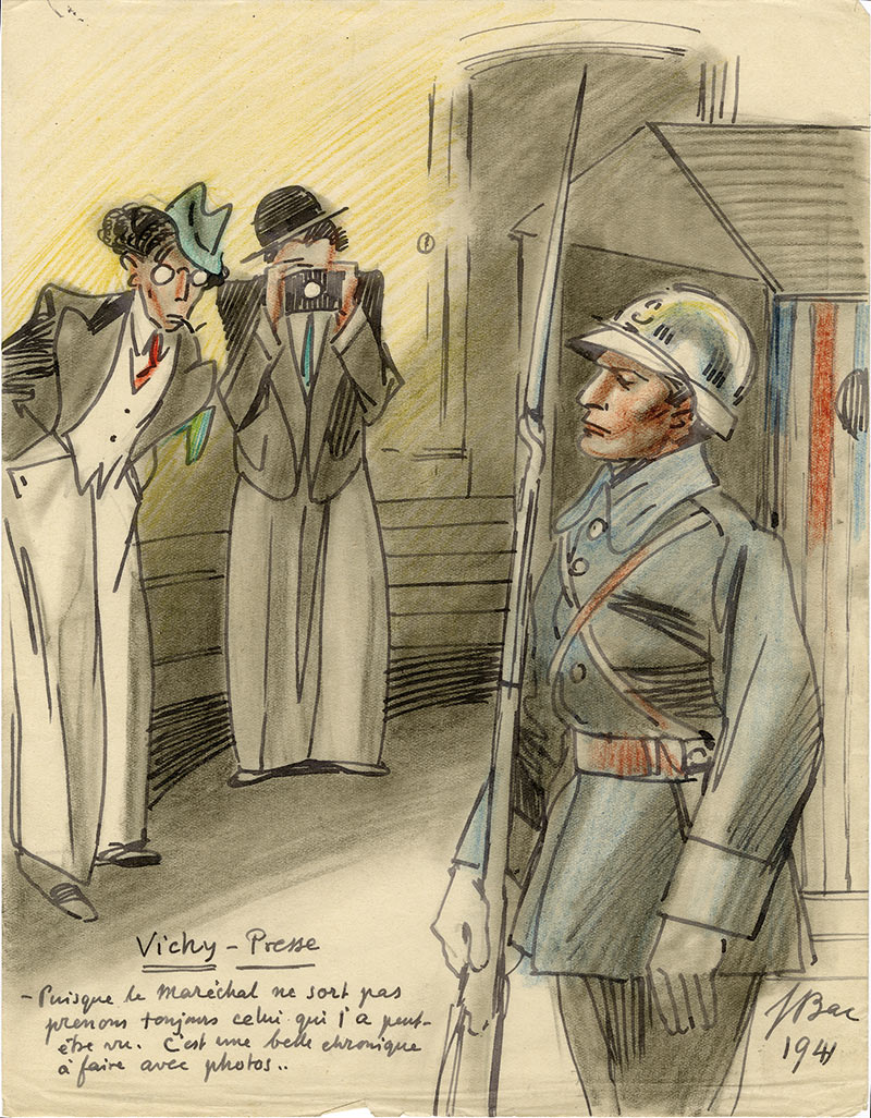 Dessin original à l’encre et aux crayons de couleurs, signé et légendé.Dessin original à l’encre et aux crayons de couleurs intitulé « Histoire gaie II. — Tout est calme dans la cité », signé, daté de 1941 en bas à gauche.Dessin concernant l’évasion de communistes.Est collée en bas à droite...