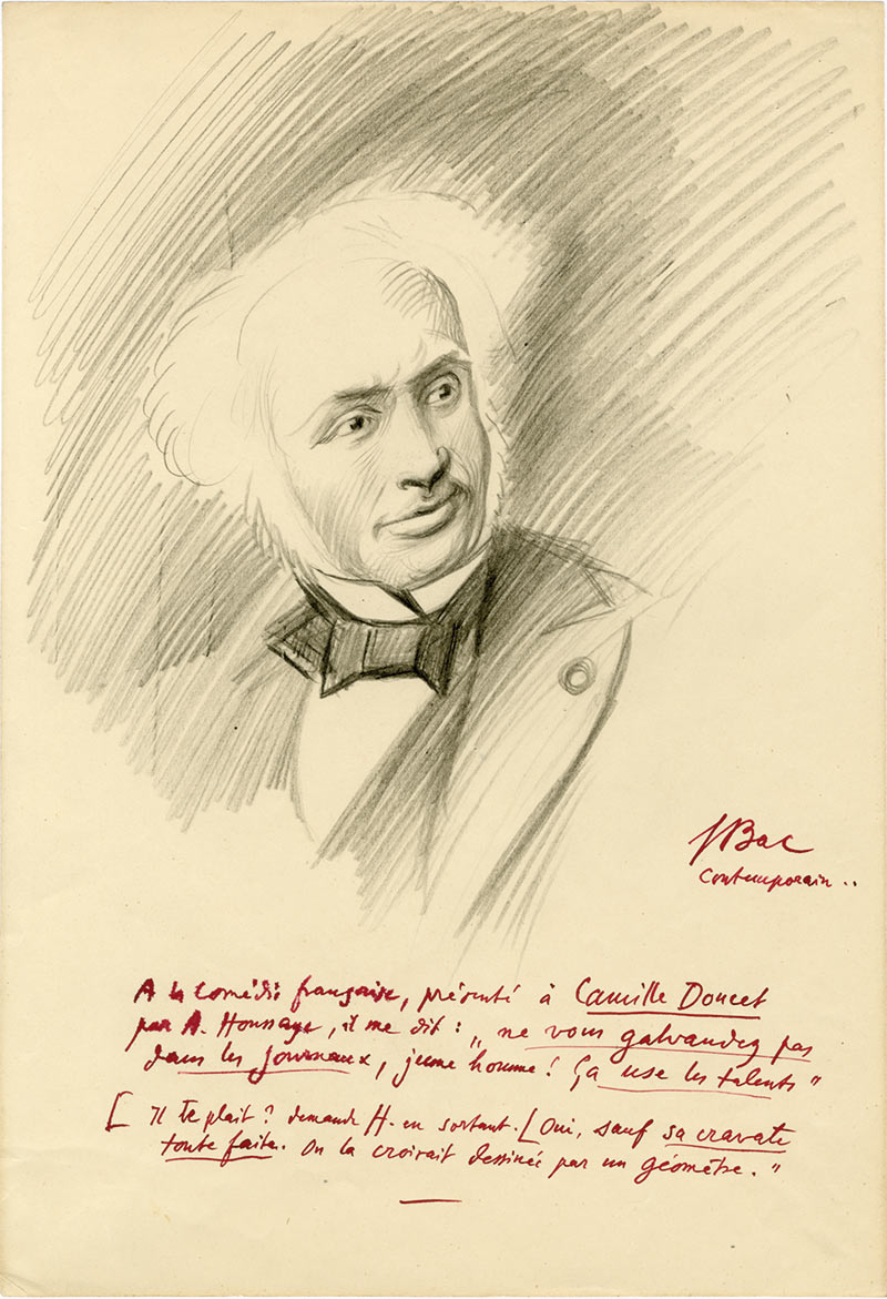 Dessin autographe signéDessin autographe signé. 33 X 22,5 cm. Dessin au crayon représentant Camille Doucet légendé à l’encre rouge : « À la Comédie française, présenté à Camille Doucet par A. Houssaye, il me dit : “ Ne vous galvaudez pas dans...