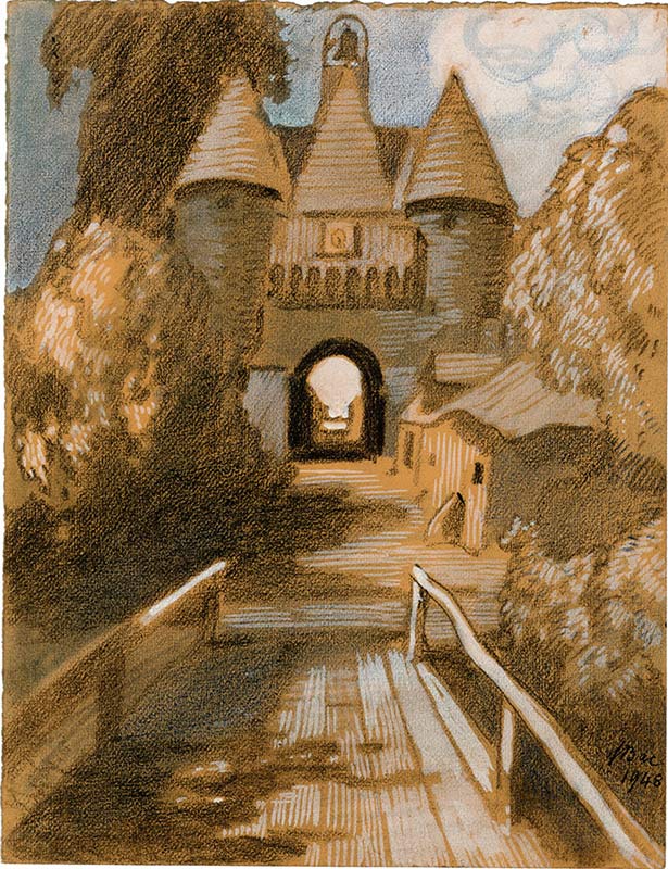 Dessin original signéDessin original signé aux crayons de couleur. 1948 ; 32,5 X 25 cm. Entrée de château.