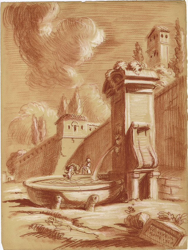 Dessin originalDessin original au crayon de couleur. Sans date ; 39,5 X 29,5 cm. Devant une fontaine à Rome. Dessin attribué à F. Bac. Superbe dessin en sanguine.