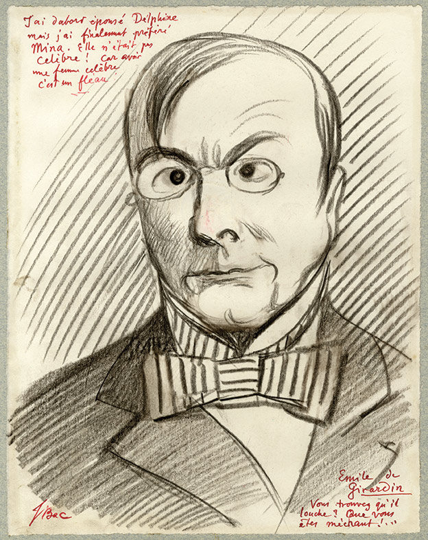 Dessin original signé.Dessin original signé. [Circa 1950] ; 27 X 21 cm au crayon et encre rouge pour la partie écrite. Portrait d'Émile de Girardin, légendé : « J'ai d'abord épousé Delphine mais j'ai finalement préféré Mina. Elle n'était pas...