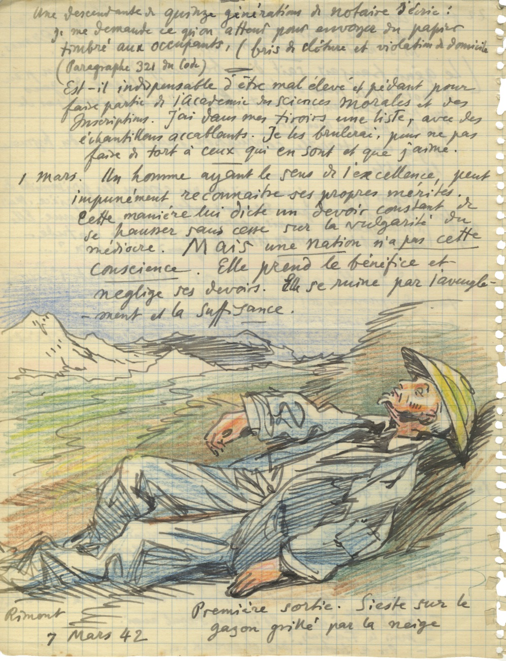 Lettre autgraphe signéeLettre autographe signée avec un très beau dessin en couleurs représentant un homme couché. 22 février 1942 ; 2 pages in-4° provenant d’un cahier à spirales à petits carreaux. ...