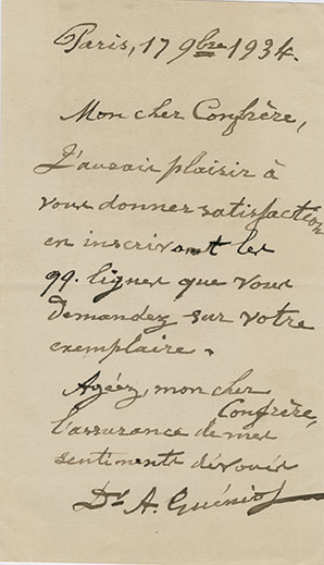 Lettre autographe signéeLettre autographe signée, adressée à un confrère. Paris, 17 novembre 1934 ; 1 page in-12. « J'aurais plaisir à vous donner satisfaction en inscrivant les qq. lignes que vous me demandez sur votre exemplaire. » Rare lettre à l'âge...