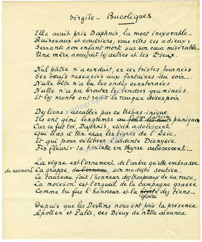 Manuscrit autographe signé.Manuscrit autographe signé. Octobre 1957 ; 2 pages in-4°, avec corrections. Traduction en vers français des Bucoliques de Virgile destinée à paraître dans un ouvrage chez Grasset en 1958.« Virgile — BucoliquesElle avait pris...