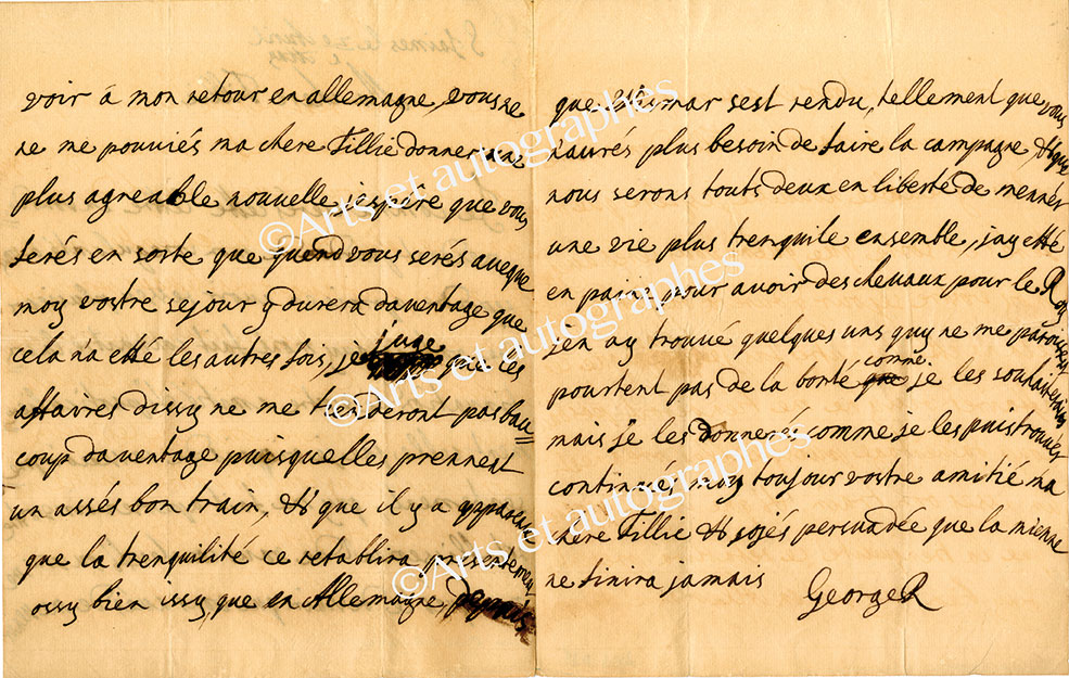 Lettre autographe signéeLettre autographe, signée « George R », adressée à sa fille Sophie Charlotte de Hanovre, deuxième femme de Frédéric Ier, roi de Prusse. Saint-James, « 20 avril » ; 3 pages in-4°, en français. Il lui exprime la satisfaction «...