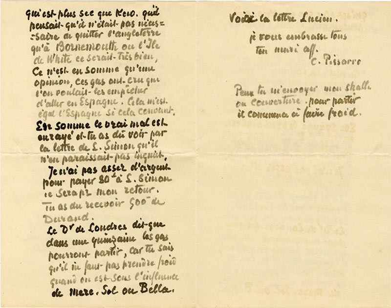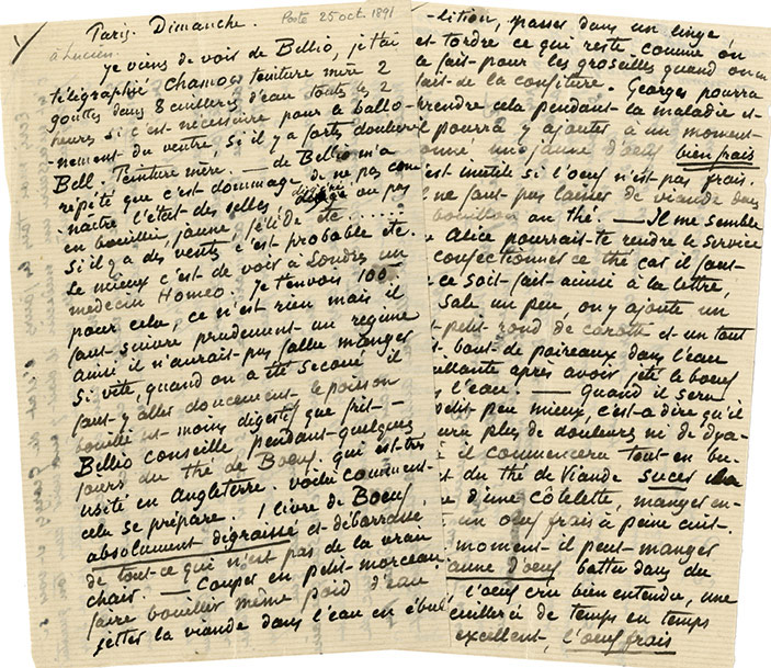 Lettre autographe signéeLettre autographe, signée « C.P », [adressée à son fil, Lucien Pissarro]. « Paris. Dimanche » [25 octobre 1891] ; 4 pages in-8° dont 2 oblongues, avec 2 petits dessins. Étonnante lettre de Camille Pissarro qui se transforme en...