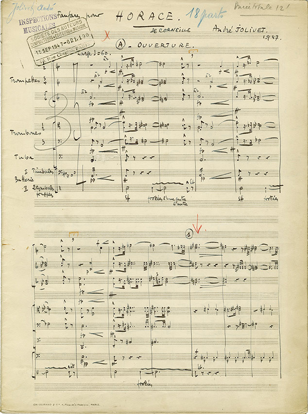 Manuscrit musical autographe signéManuscrit musical autographe signé, Fanfares pour Horace [K129], 1947 ; 36 pages in-folio. Musique de scène inédite pour la tragédie de Pierre Corneille, créée à Lyon, au théâtre de Fourvière, le 28 juin 1947, sous la direction du...