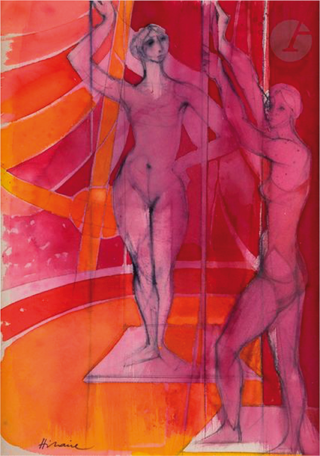 Aquarelle sur traits de crayon.La Trapéziste.Aquarelle sur traits de crayon.Signée en bas à gauche.51 x 35 cm.Provenance : Acquis à la fille de lartiste, le 18 février 2000.Oeuvre référencée sous le numéro 2-08-001.