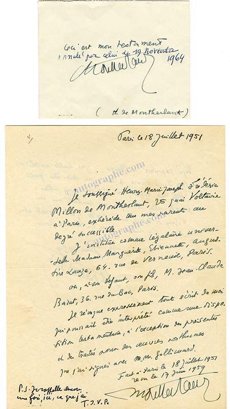 Pièce autographe signéePièce autographe signée. Paris, 18 juillet 1951 et 17 juin 1959 ; 1 page 1/2 in-4°, enveloppe avec cachets de cire rouge aux armes. Il s’agit de son testament. « Je soussigné Henry-Marcel-Joseph-Frédéric Millon de Montherlant […]...
