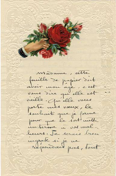 Lettre autographe signéeLettre autographe signée. Sans date ; 1 page 1/2 in-8° sur papier ancien gaufré avec une chromolithographie représentant un bouquet de fleurs.« Madame, cette feuille de papier doit avoir mon âge, c’est vous dire qu’elle est...