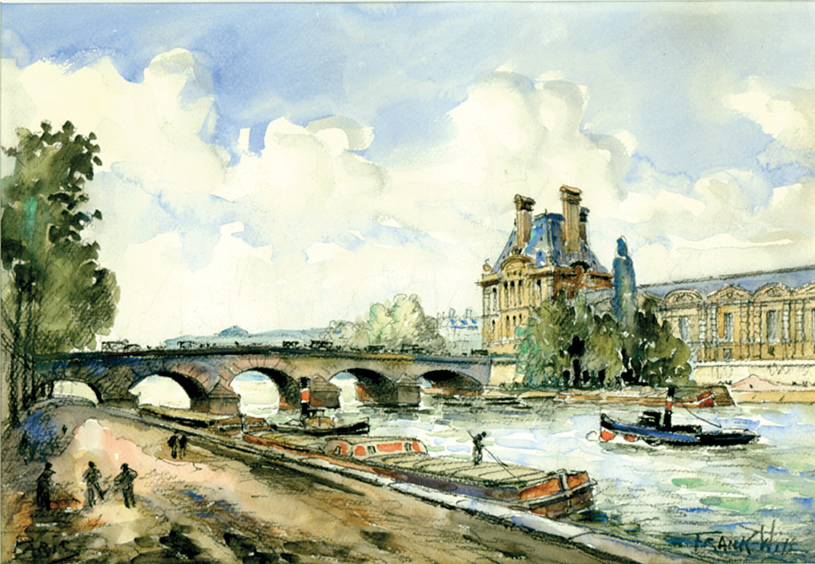 Aquarelle et fusainLe Louvre et le pont du Carrousel. Aquarelle et fusain sur papier signé en bas à droite « Franck Will ». 23,4 x 32,2 cm.