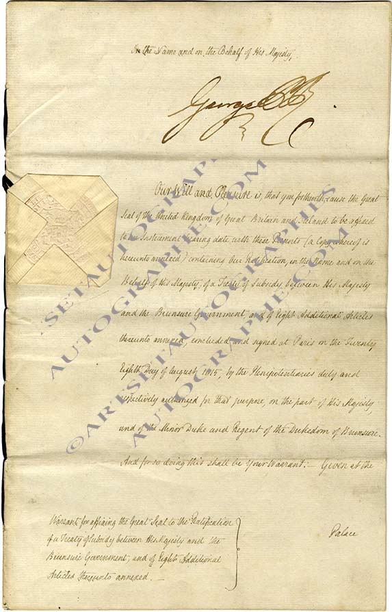 Pièce signéePièce signée. Palais de Carlton House 27 décembre 1815 ; cahier in-folio de 10 pages, sceau aux armes sous papier ; en anglais, translation anglaise jointe. Copie ratifiée et signée comme prince régent pour le roi George III, et...