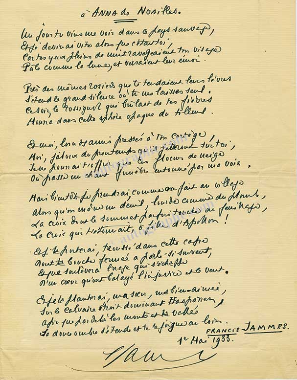 Poème autographe signéPoème autographe signé. 1er mai 1933 ; 1 page grand in-4°, sur papier vergé. Superbe poème dédié à Anna de Noailles qui venait de s’éteindre le 30 avril.« à Anna de Noailles.Un jour tu vins me voir dans ce pays sauvage,Et je...