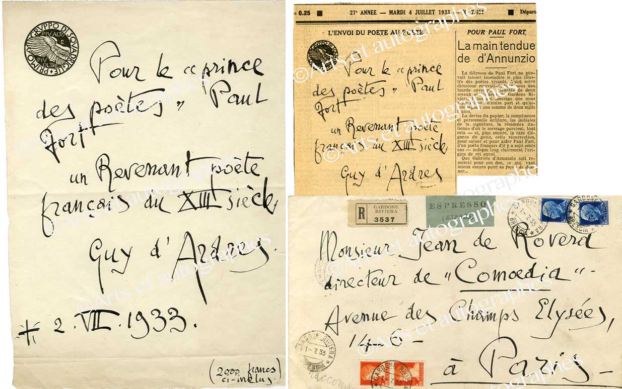 Lettre autographe signéeLettre autographe signée, adressée à M. Jean de Roverd, directeur de Comœdia. 2 juillet 1933 ; 1 page grand in-4°. En-tête imprimé de son escadrille « Primo Gruppo di Squadriglie », avec son enveloppe timbrée. « Pour le...