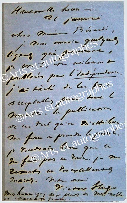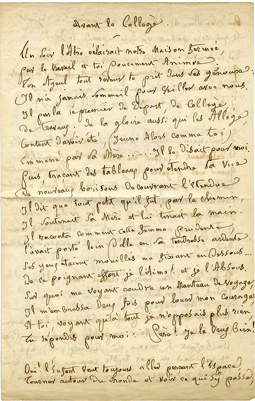 Poème autographe, intitulé « Avant le collège ».Poème autographe, intitulé « Avant le collège ». Sans date ; 3 pages 1/4 grand in-4°. Publié en 1860 dans Poèsies inédites sous le titre : « À mon fils avant le collège ».Notre manuscrit présente des différences avec celui...