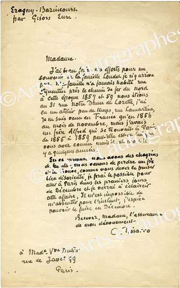 Lettre autographe signéeLettre autographe signée, adressée à Madame veuve Duter à Paris. Éragny-sur-Epte dans l’Eure, 27 novembre 1897, d’après les cachets postaux ; 1 page in-8°, enveloppe jointe. Poignante lettre évoquant ses débuts à Paris et la...