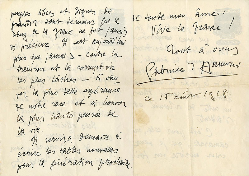 Lettre autographe signéeLettre autographe signée. « Ce 15 août 1918 » ; 3 pages 1/2 in-4°, sur 2 feuilles à en-tête imprimé de son escadrille « Semper Adamas. Prima squadriglia navale. Il comandante ». Indisposé, il décline une invitation à déjeuner...