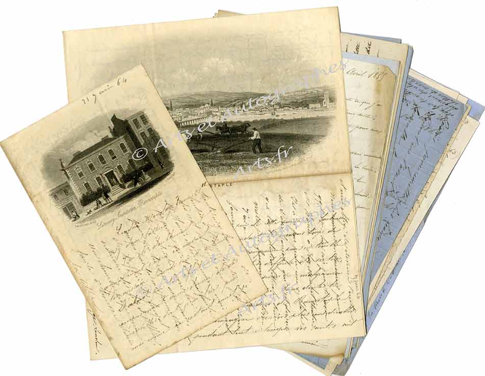 Correspondance de 13 lettresCorrespondance de 13 lettres avec notamment deux lettres sur papier à en-tête illustré, l’une d’un paysan labourant devant la ville de Barnstaple (gravure de 190 X 110 mm), l’autre de la gravure représentant la Library Institution...