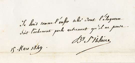 Pensée autographe signéePensée autographe signée. 15 mars 1849 ; 1/2 page in-8°. « Je hais comme l’enfer celui dont l’éloquence sait lâchement parler autrement qu’il ne pense. By St Hilaire »