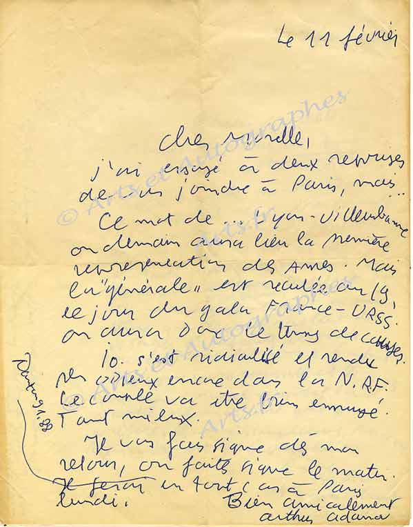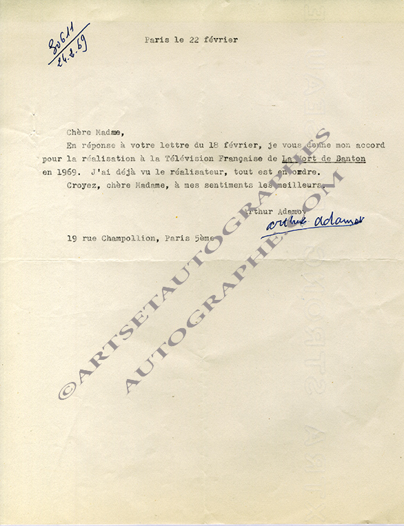 Lettre signéeLettre signée, adressée à Mme Suzanne Arnoux. Paris, 22 février [1969] ; 1/2 page in-4°. « En réponse à votre lettre du 18 février, je vous donne mon accord pour la réalisation à la Télévision Française de La Mort de Danton en...