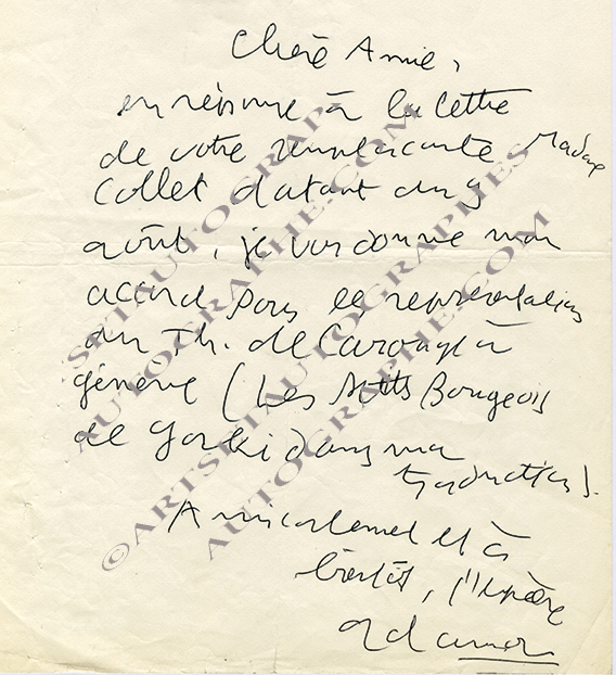 Lettre autographe signéeLettre autographe signée, adressée à Marcelle Wildschitz. 1 page in-4°. Sur l’autorisation de représenter une pièce de Gorki, traduite par lui : « Je vous donne mon accord pour les représentations du Th. de Carough à Genève ».