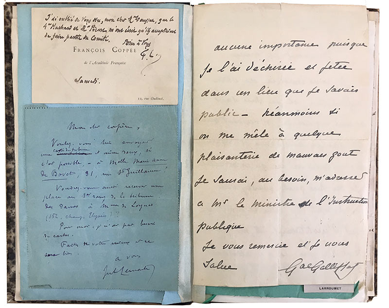 Ensemble de lettres autographes et cartesEnsemble de lettres autographes et cartes des années 1871 à 1918, réunies dans une ancienne reliure du XIXe, dont certaines faisant allusion à l’affaire Dreyfus, écrites par le général Galliffet, Gyp, Coppée, Hyacinthe Loyson,...