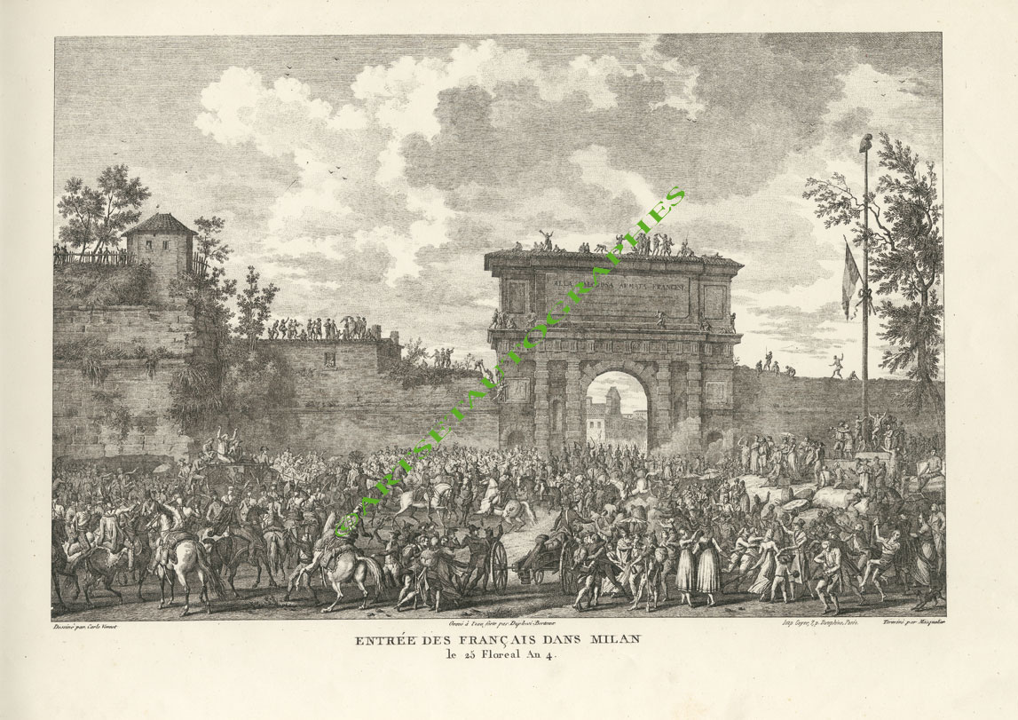 GravureENTRÉE DES FRANÇAIS DANS MILAN [14 mai 1796]. Grande gravure représentant une scène de l’entrée des troupes françaises à Milan. Tirage du Second-Empire ; 390 X 255 mm sur un feuillet de 490 X 335 mm. Gravée par Masquelier...