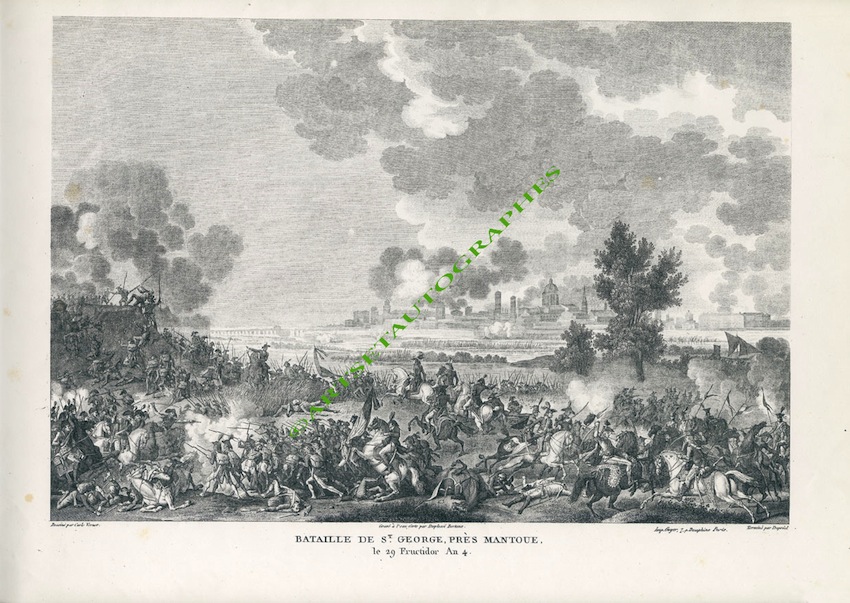 BATAILLE DE ST GEORGE, PRÈS MANTOUEBATAILLE DE ST GEORGE, PRÈS MANTOUE, LE 29 fructidor An IV [15 septembre 1796]. Grande gravure représentant une scène de la bataille de St George près de Mantoue. Tirage du Second-Empire ; 380 X 258 mm sur un feuillet de 490 X 335 mm,...