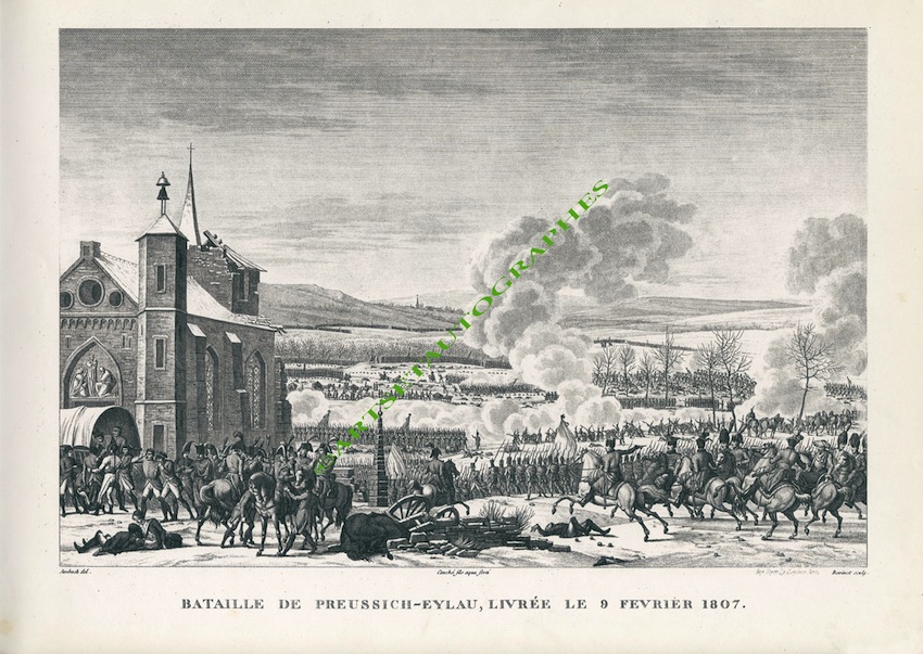 GravureBATAILLE DE PREUSSICH-EYLAU, LIVRÉE LE 9 FÉVRIER 1807. Grande gravure représentant Napoléon au milieu de ses troupes sur le champ de bataille. Tirage du Second-Empire ; 380 X 255 mm sur un feuillet de 490 X 335 mm. Gravée par Bovinet...