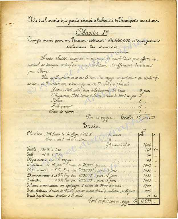 Pièce imprimée.Pièce imprimée. « Note sur l’avenir qui paraît réservé à la Société des Transports maritimes.» Genève, 31 décembre 1865 ; 11 pages in-4°. Concerne le compte dressé pour un bateau transportant uniquement des minerais...