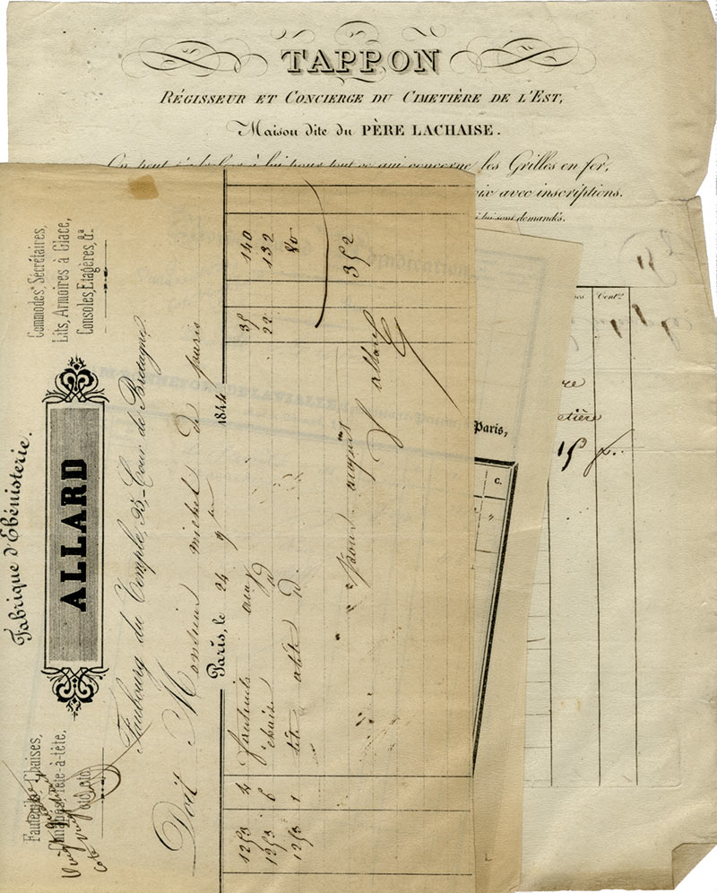 Factures de la maison AllardFactures de la maison Allard (ébénisterie à Paris, 1844); bordereau d’adjudication du commissaire-priseur Bonnefons (Paris, 1840). On joint une facture de l’horloger Picquart-Vitoux (Saint-Mihiel, 1840) et une facture pour acquis de...
